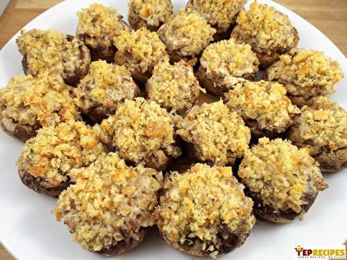 Mushroom caps filled with cream cheese and sausage topped with crispy herb breadcrumbs.