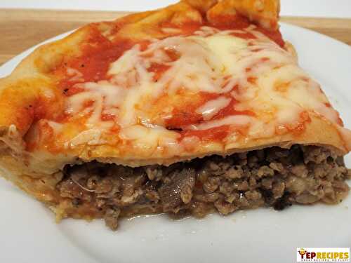Sausage, mushrooms, cheese, and tomato sauce baked in between two homemade pizza crusts.