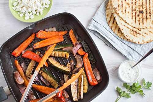 Easy vegetarian fajitas, made Mediterranean with balsamic vinegar, feta cheese and a herby yogurt dressing.