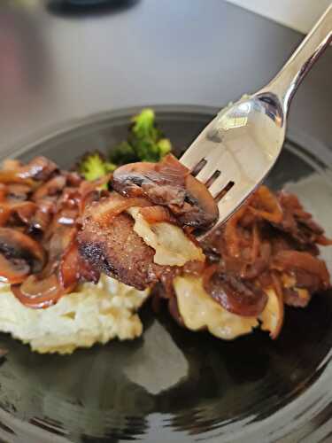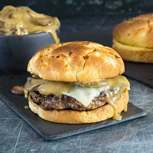 This mouthwatering mushroom Swiss burger is smothered in a luxuriously silky mushroom gravy, melted Swiss cheese and served on a toasted bun.
