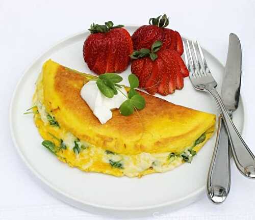 A recipe for pea shoots and Swiss cheese omelet an American-style three-egg omelet filled with fresh pea shoots and Swiss cheese.