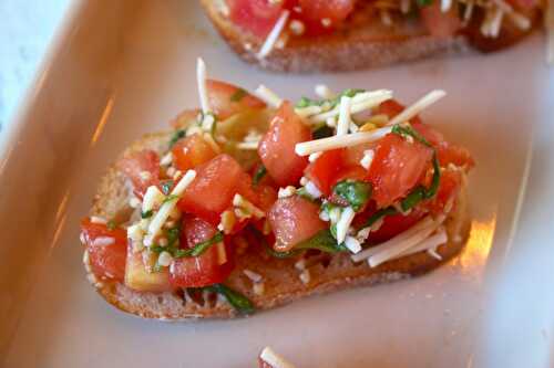 This tomato bruschetta is a wonderful appetizer that's easy to whip up in minutes! The toasty bread topped with a blend of tomatoes, basil, garlic, and balsamic vinegar is delicious without the oil, and will be loved by vegans and non vegans.
