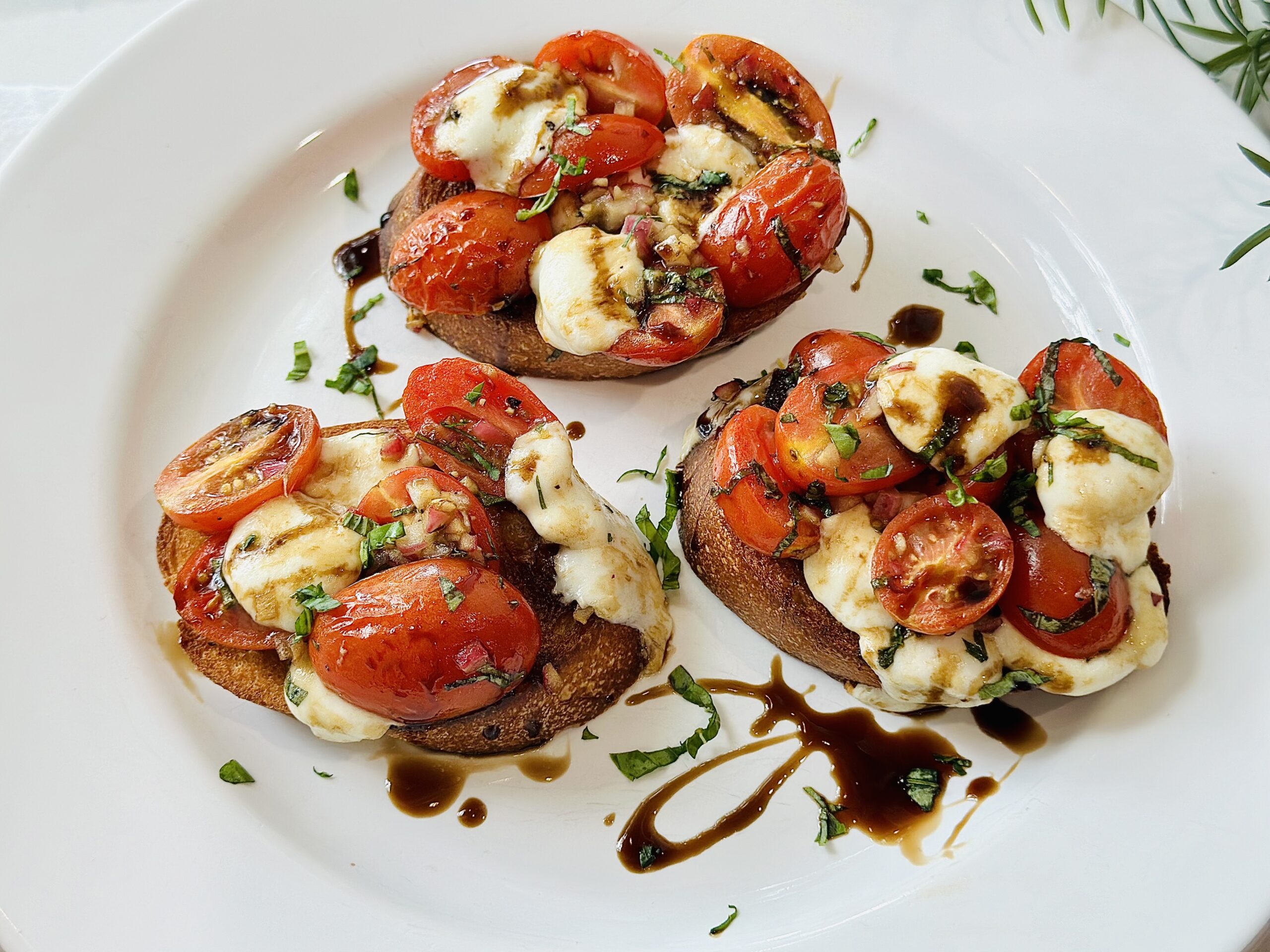 Warm cherry tomatoes are nestled in mozzarella cheese on top of toasted bread; this is summer heaven!