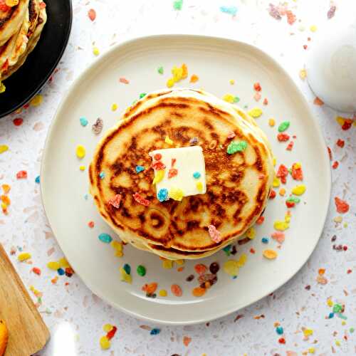 These Fruity Pebble Pancakes combine two breakfast favorites into one ridiculously tasty recipe! These pancakes are infused with fruity pebble milk and packed with vanilla protein powder and cashew butter for a filling and tasty breakfast!