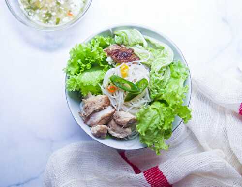 Simple and healthy rice vermicelli bowl with grilled Chinese cabbage and served with Vietnamese dipping sauce.