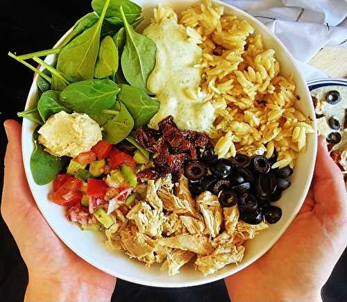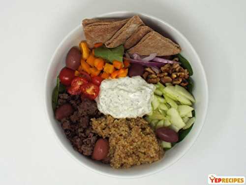 Gyro spiced ground beef served with vegetables, olives, quinoa, tzatziki, and pita bread.