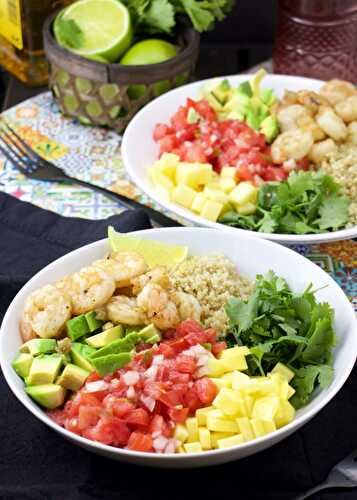 Mexican Shrimp Bowl is a fun and easy bowl filled with Tequila sauté shrimp, avocado, cilantro leaves, pico de gallo, mango, cilantro and quinoa for a delightful Mexican dinner.