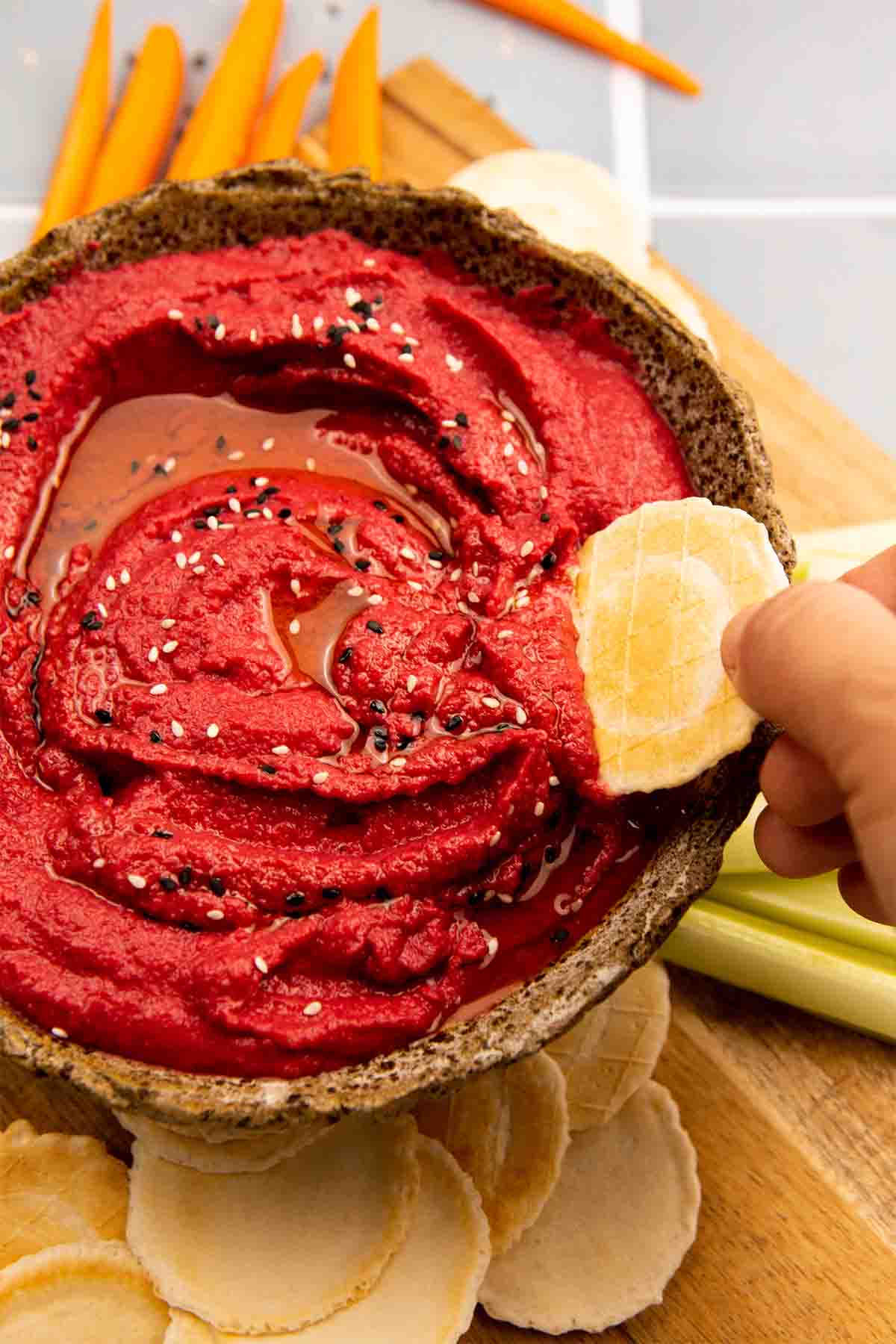 This beetroot and chickpea hummus is bright pink, creamy, flavorful and nutritious.