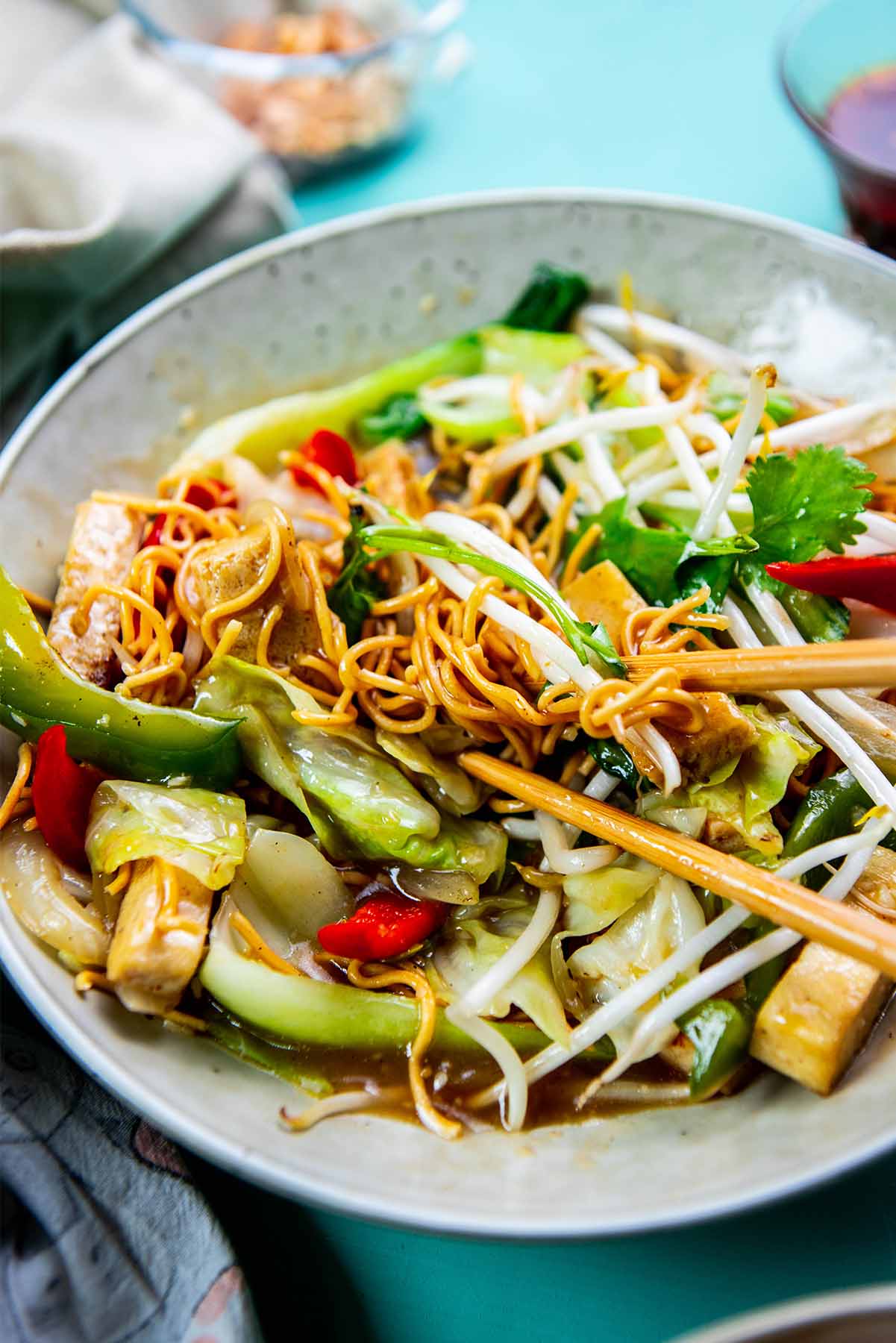 Mie goreng is a classic Indonesian dish where noodles are stir-fried with a paste made of shallots, garlic, and candlenuts.