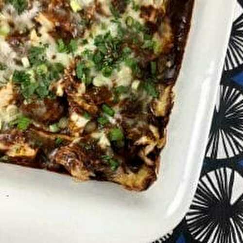 This recipe for chicken mole enchilada casserole uses cauliflower tortillas to keep the carb count down and the veggie count up.