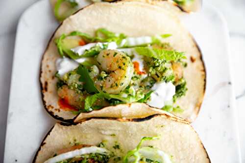 Adapted from The Food Processor Family Cookbook (Sonoma Press, 2016), by Nicki SizemoreThese healthy shrimp tacos feature sautéed (or grilled!) shrimp, a vibrant cilantro lime pesto (which you’ll want to slather on everything), creamy avocados and crunchy.