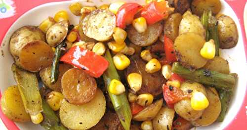 Comforting kid-friendly chicken soup with chunky vegetables, sausages, and gluten-free pasta shapes.