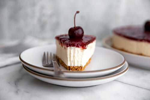 This no-bake creamy, velvety cheesecake has all the good things! White chocolate, vanilla cheesecake, whipped cream and cherry pie filling and a delicious nutty graham cracker crust.