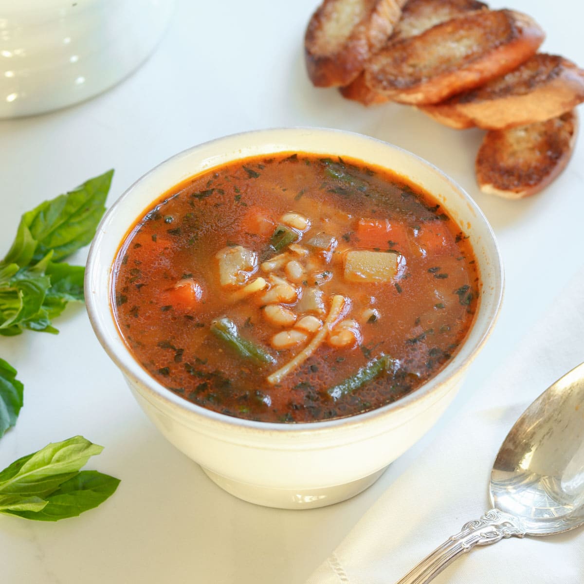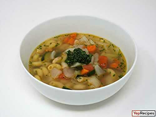 A white bean and vegetable soup with macaroni pasta and a homemade French style pesto sauce.