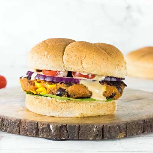 The burgers have a base of black beans and quinoa, with onions, peppers, carrots, and corn for some veggie goodness.