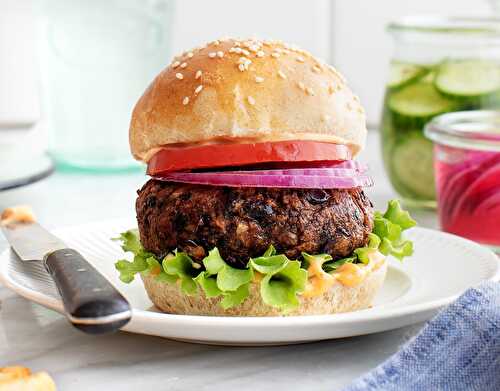 Here’s a quick and easy black bean mushroom burger recipe that requires 15 minutes of your time (+ baking time), a food processor and oven.