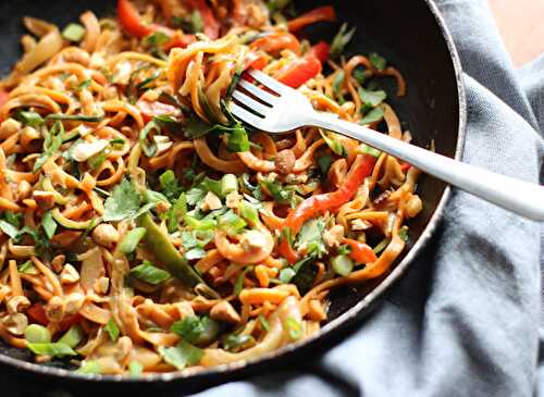 Swoodles and zoodles in a silky spicy peanut sauce under a shower of cilantro, scallions, and chopped peanuts.
