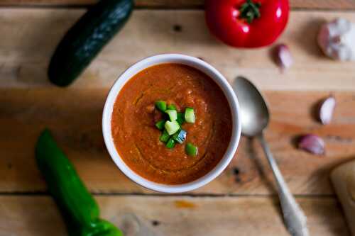 Gazpacho is a classic, chilled, healthy Spanish soup mainly made with fresh tomatoes, red peppers and cucumbers.