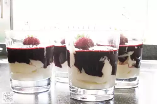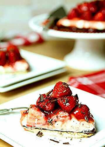 A wonderfully rich dessert with a base that includes mascarpone cheese, topped with a chocolate layer and strawberries.