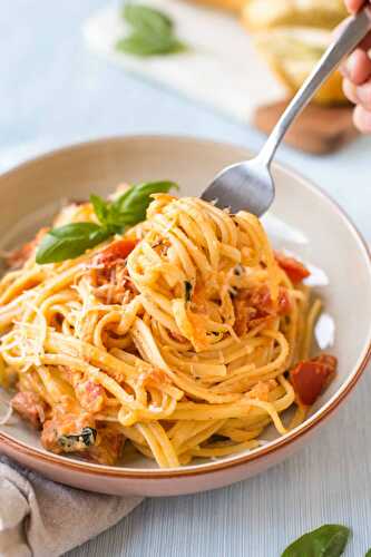 A quick and easy pasta recipe, made with fresh tomatoes and ultra creamy mascarpone cheese.