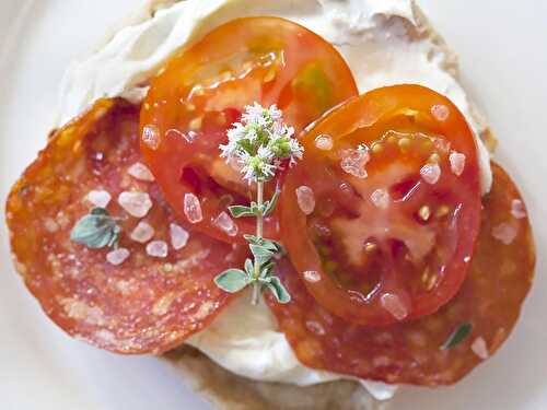 Celebrate spring with these easy, grilled pizzas topped with lemon flavored Mascarpone cheese, fresh tomatoes, pepperoni and oregano flowers