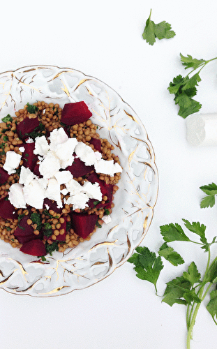 Beetroot and apricot salad topped with fresh goat cheese and pistachios.
