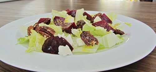 A crisp beetroot and goats cheese salad with hot candied pecans and a mustard vinaigrette.
