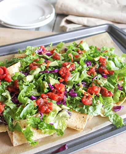 Black bean sheet pan nacho salad is filled with crispy chips, black beans, cheese and topped with salad ingredients for a quick, easy and nutritious meal.