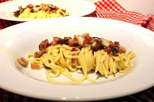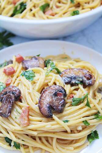 Spice up your weeknights with this mushroom carbonara with pancetta! This easy pasta recipe is made with crispy pancetta, a blend of gourmet mushrooms and tossed with shallot, garlic and lots of carbonara sauce! This is a meal the entire family will.