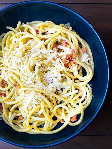 Recipe Pasta carbonara express instant pot - If you like carbonara pasta style of food and you are in a hurry, you could try that simple and quick preparation of pasta with cream, bacon and parmesan cheese on top.