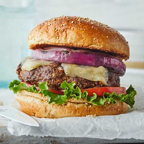 This juicy burger with roasted garlic aioli, caramelized onions, bacon, and cheese on a Hawaiian roll bun is a mouth-wateringly delicious restaurant-style treat.