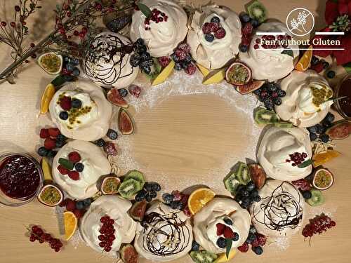 Making this mini Pavlova Christmas wreath dessert is easy to do with an assortment of berries, fruit, cream, chocolate & raspberry sauces.