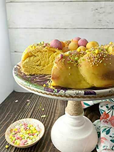 This Easter saffron wreath bread can be made with regular or spelt flour and is topped with a simple glaze and spring colored sprinkles