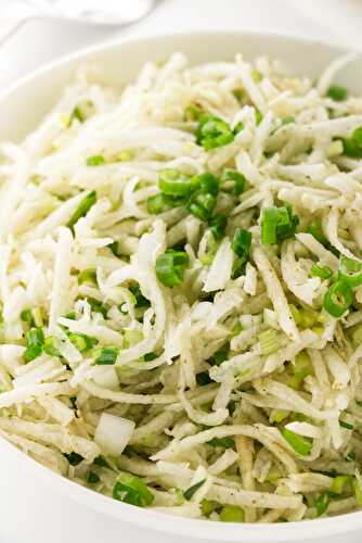 The light, sweet flavor and crunchy texture of Jicama make a perfect slaw for fish tacos or a simple side salad.