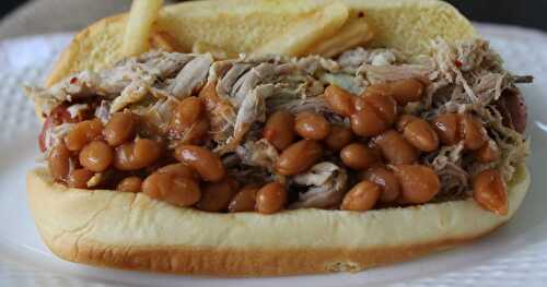Pork and slaw top an angus hot dog creating a taste of the south with beans, slaw, pork and french fries.