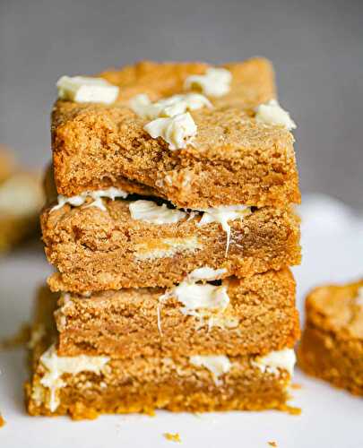 These soft and chewy Biscoff White Chocolate Cookie Bars are deliciously flavored with Biscoff spread and loaded with white chocolate throughout! You won't be able to back away from this scrumptious Biscoff and white chocolate combination together!