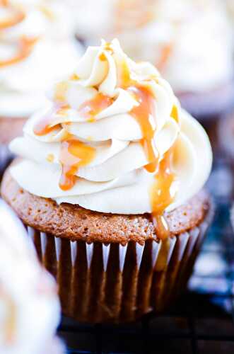 Vanilla cupcakes filled with caramel, topped with caramel buttercream frosting, and drizzled with even more caramel!