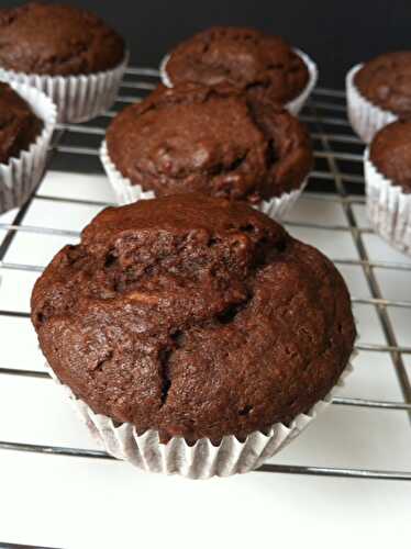 Rich chocolate muffins made with cocoa powder and chocolate chips.