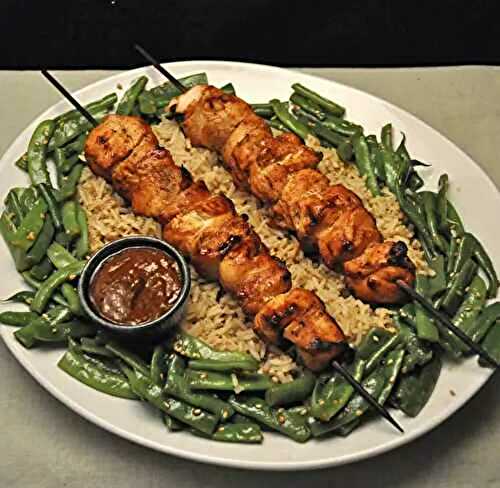 Grilled Chicken Satay with Peanut Sauce, Crisp Soy Sauce Green Beans and Sesame Brown Rice
