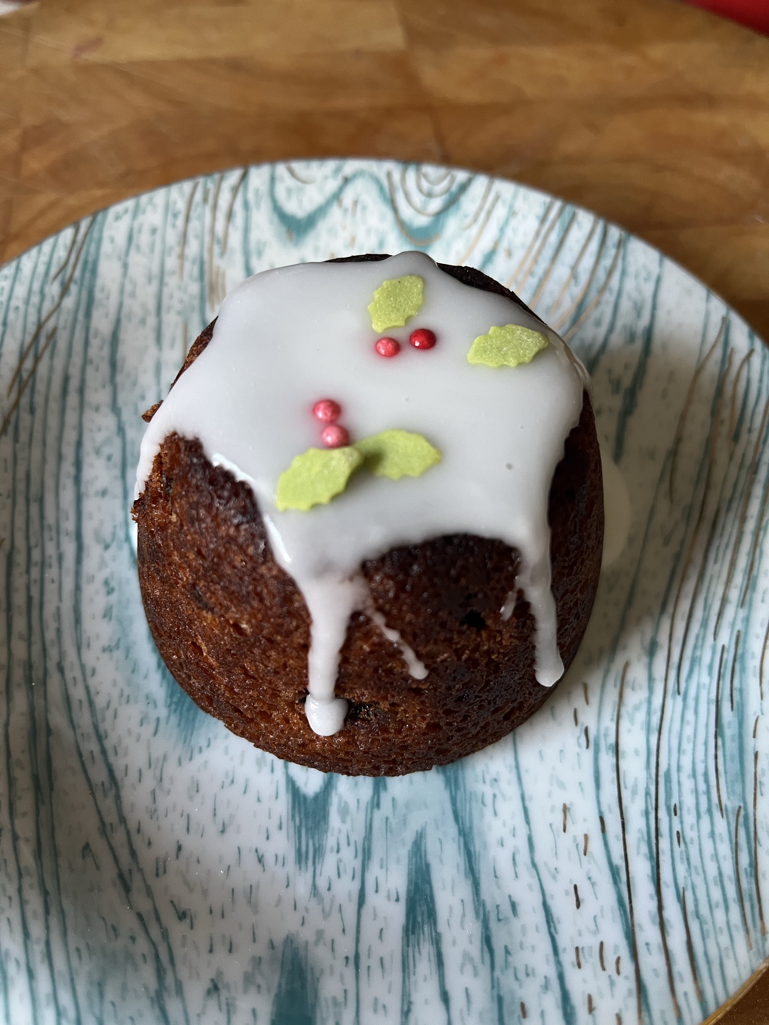 Christmas cake is a traditional British fruit cake covered with marzipan and decorated in royal icing.