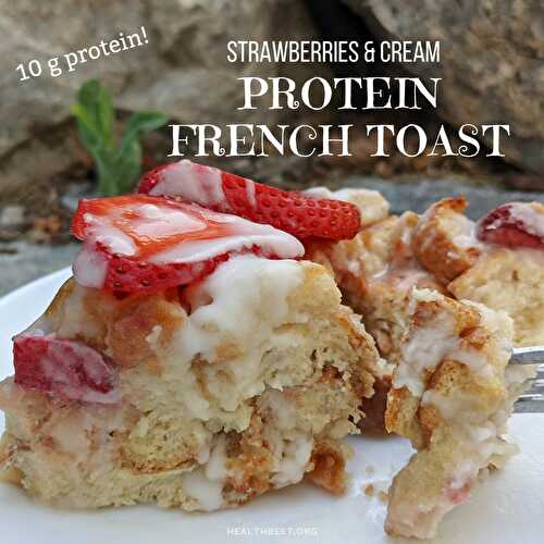 Strawberries and cream protein french toast casserole! By adding vanilla protein powder and egg whites, I was able to get 10 grams of protein per serving for this delicious and healthy breakfast!!