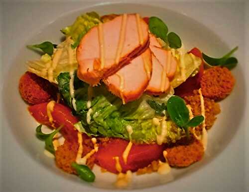 Chicken breast, fresh peach and croutons go on a bed of salad greens.