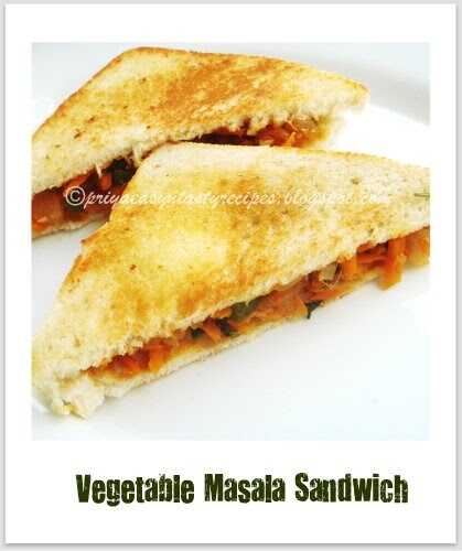 A sandwich made with a spicy preparation of cooked carrot and capsicum stuffing along with some cheese and fresh vegetables.