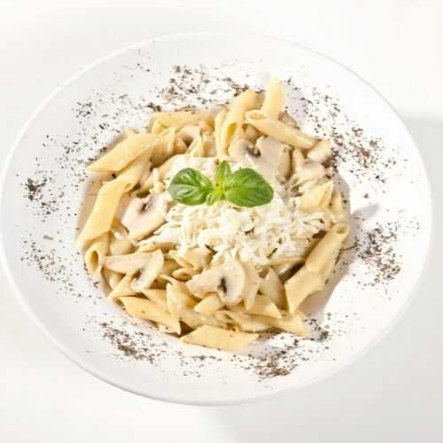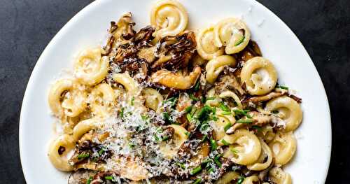 Creamy goat's cheese and mushroom pasta with walnuts and basil.