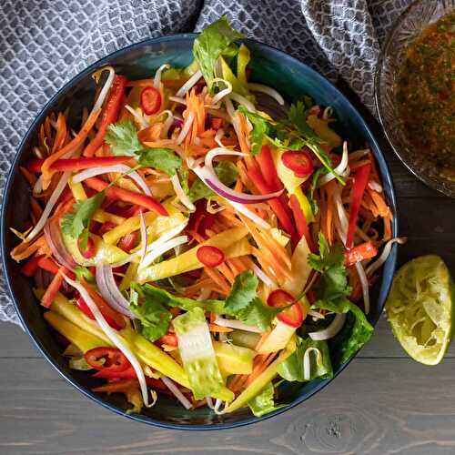 This fresh-tasting Spicy Thai Mango Salad features unripe green mango, crisp bean sprouts, crunchy carrots, and sweet red peppers.