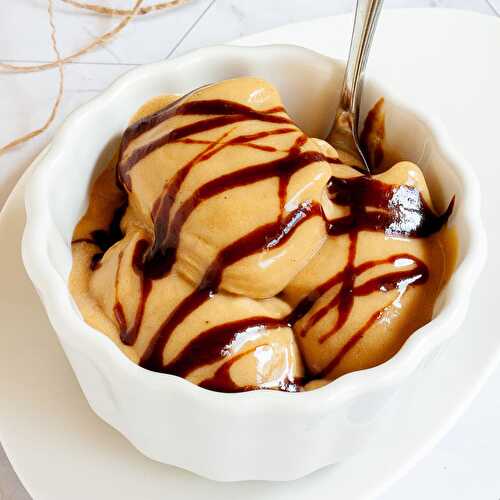 This caramel nice cream is not only frozen bananas blended into ice cream topped with a swirl of vegan caramel sauce.