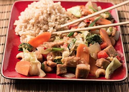 This Cashew Veggie Stir Fry is loaded with fresh vegetables, baked tofu, crunchy cashews, and a delicious stir fry sauce! Serve it over rice or noodles for an easy and tasty oil-free dinner.