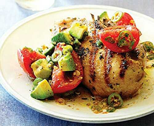 Grilled avocado with spicy tomato salsa - such a fresh and summery recipe! It's really quick and easy to make, and it's great for cooking on the BBQ.