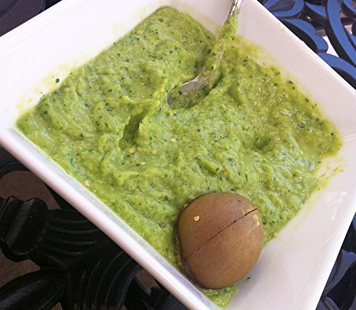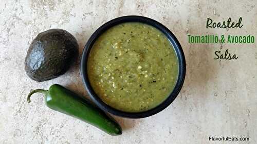 Roasted Tomatillo & Avocado Salsa is a tangy, spicy salsa verde that's made with oven-roasted tomatillos, onions, and peppers with some fresh cilantro and creamy avocado.