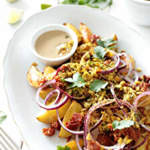 Delicious falafel crumble salad with roasted potato wedges, sun-dried tomatoes and fresh cilantro.